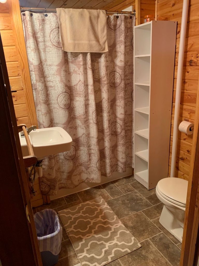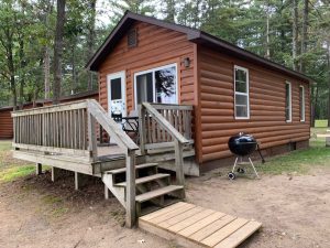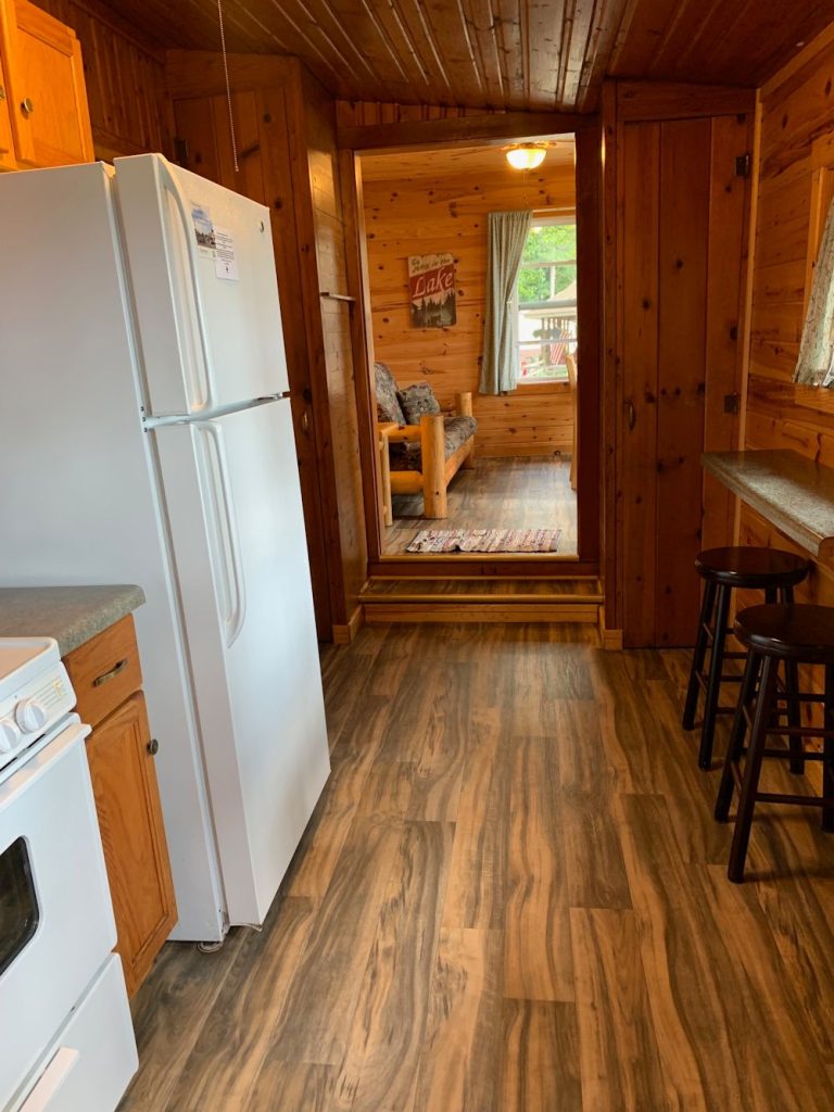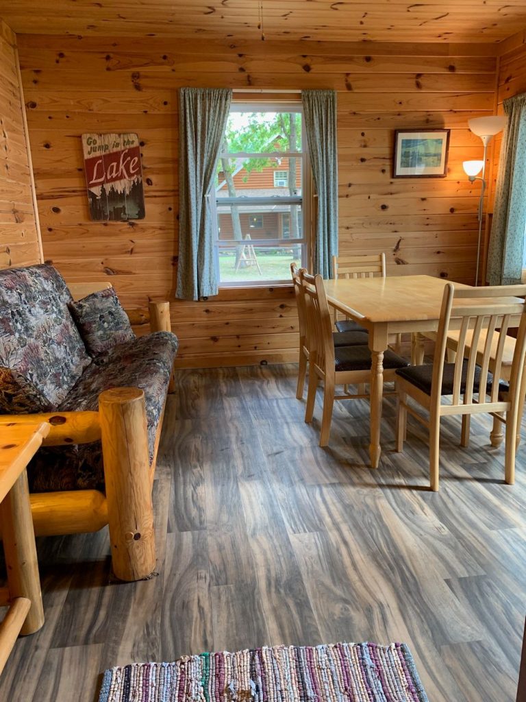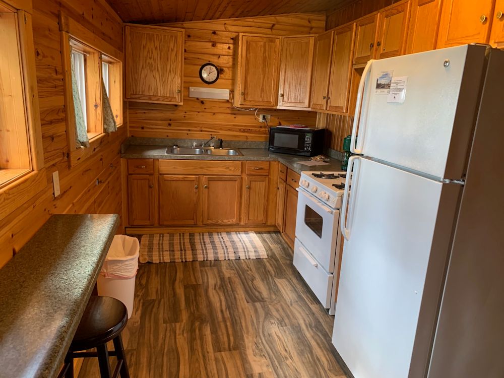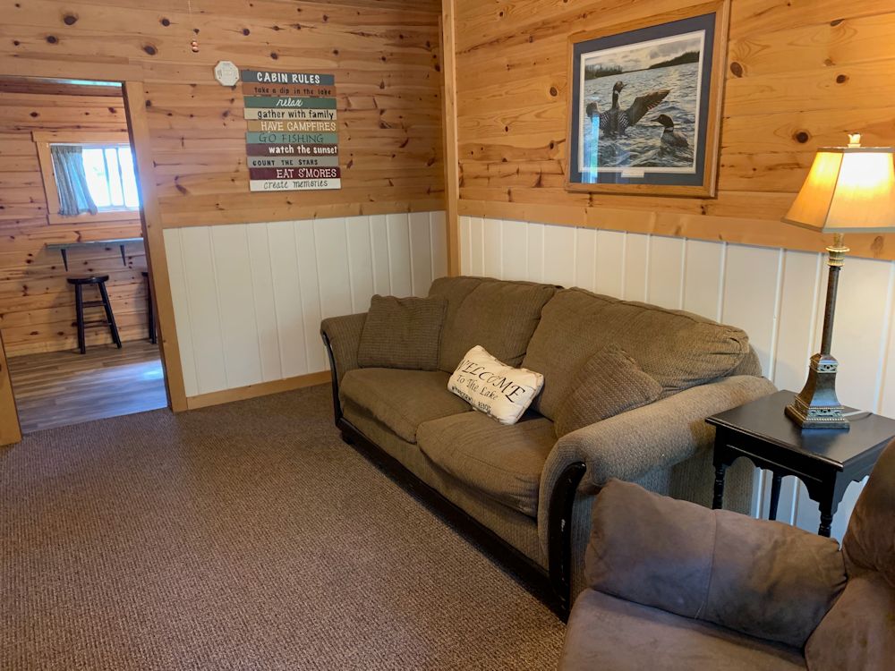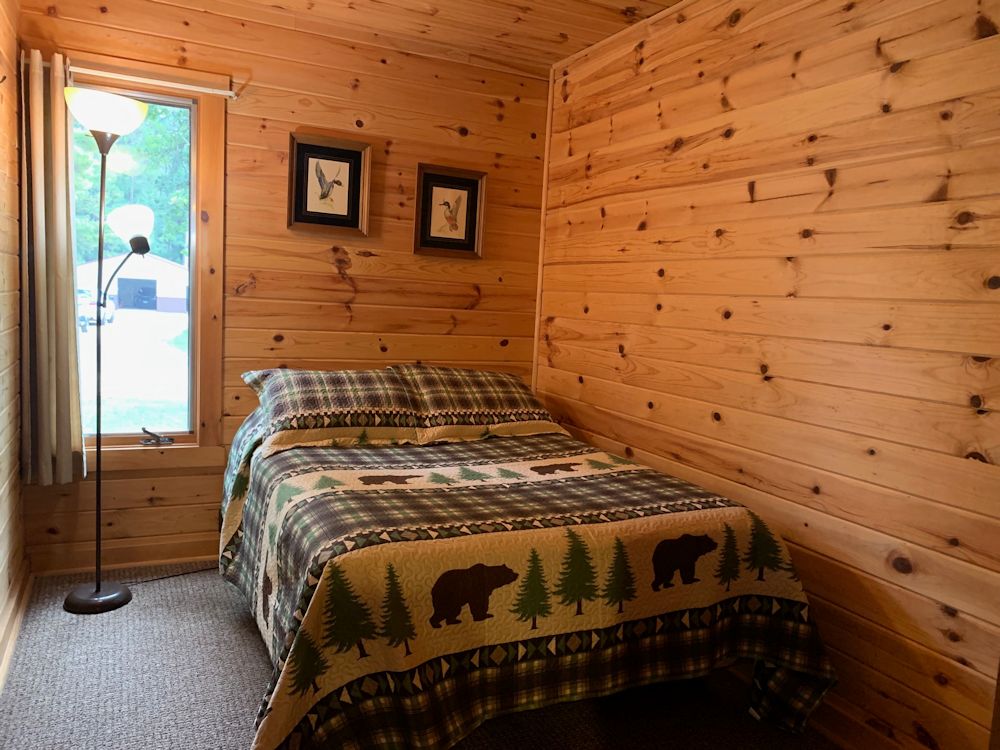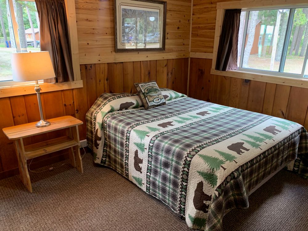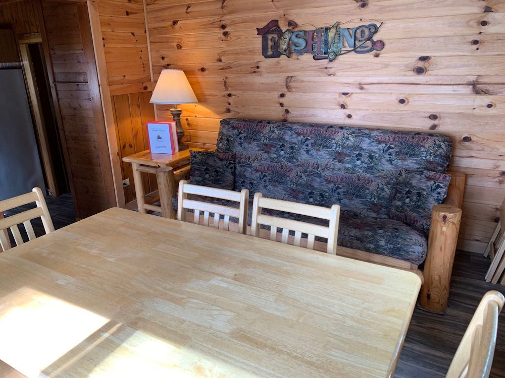 Large three bedroom cabin with one queen and two double beds. This cabin has a separate living, dining and kitchen area and a bathroom with a large shower. There is carpet and knotty pine throughout. This cabin sleeps six comfortably, eight maximum. WIFI Available.