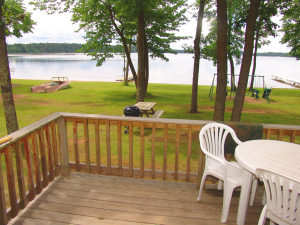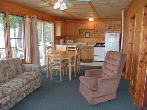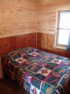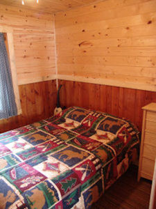 Large two bedroom cabin has one queen and one double bed. It has an open floor plan with a patio door off the dining area. The bathroom has a tub and shower. There is carpet and knotty pine throughout. This cabin sleeps four comfortably, six maximum. WIFI Available.